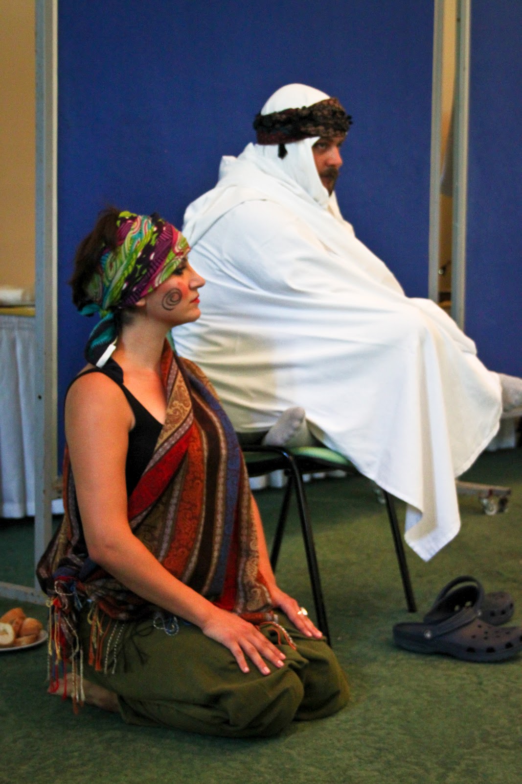 The female facilitator walks around feeds the men with the bread (like feeding children) and passes the bread into the hands of the women for them to eat the bread by themselves.
